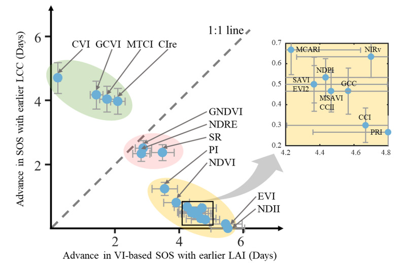 图3. 不同遥感植被指数所提取的SOS对冠层叶面积与叶绿素SOS指示能力的权衡关系