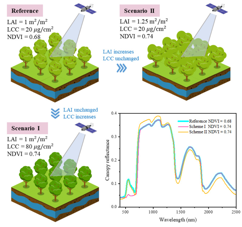 图1. 卫星NDVI检测到的不同成因下森林冠层尺度绿化示意图