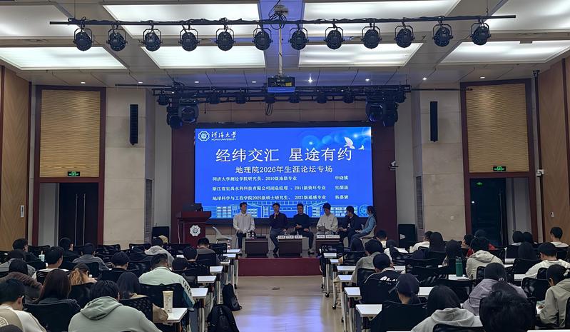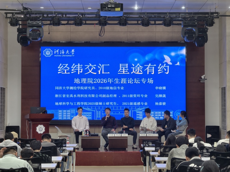 4月15日下午,地理与遥感学院在江宁校区会议中心顺利开展2026年生涯论坛,校友面对面专场活动。本次活动特邀同济大学测绘学院研究员申晓骥,浙江省宏禹水利科技有限公司副总经理完颜晟,地球科学与工程学院 2025 级硕士研究生杨嘉骏三位优秀校友与学子面对面,分享行业经验、职业历程与成长心得,助力学院学子明晰职业方向、把握发展路径。地理与遥感学院党委副书记、副院长金佳鑫,团委书记、本科生辅导员雷一帆,研究生辅导员莫晓曼,本科生辅导员蒋万缕出席活动,本科生刘峻铭、涂昊鑫、邓伊主持本次活动。