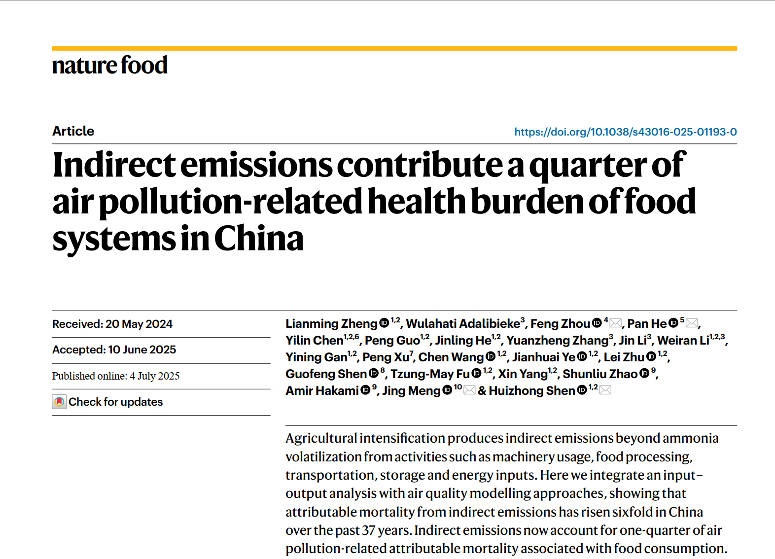 1. Fu, J.#, Jian, Y.W.#, Wang, X. H.#, Li, L., Ciais, P., Zscheischler, J., Wang, Y., Tang, Y.H., Müller, C., Webber, H., Yang, B., Wu, Y.L., Wang, Q.H., Cui, X.Q., Huang, W.C., Liu, Y.Q., Zhao, P.J., Piao, S.L., Zhou, F.* (2023) Extreme rainfall reduces one-twelfth of China’s rice yield over the last two decades. Nature Food. 4(5), 416-426.
