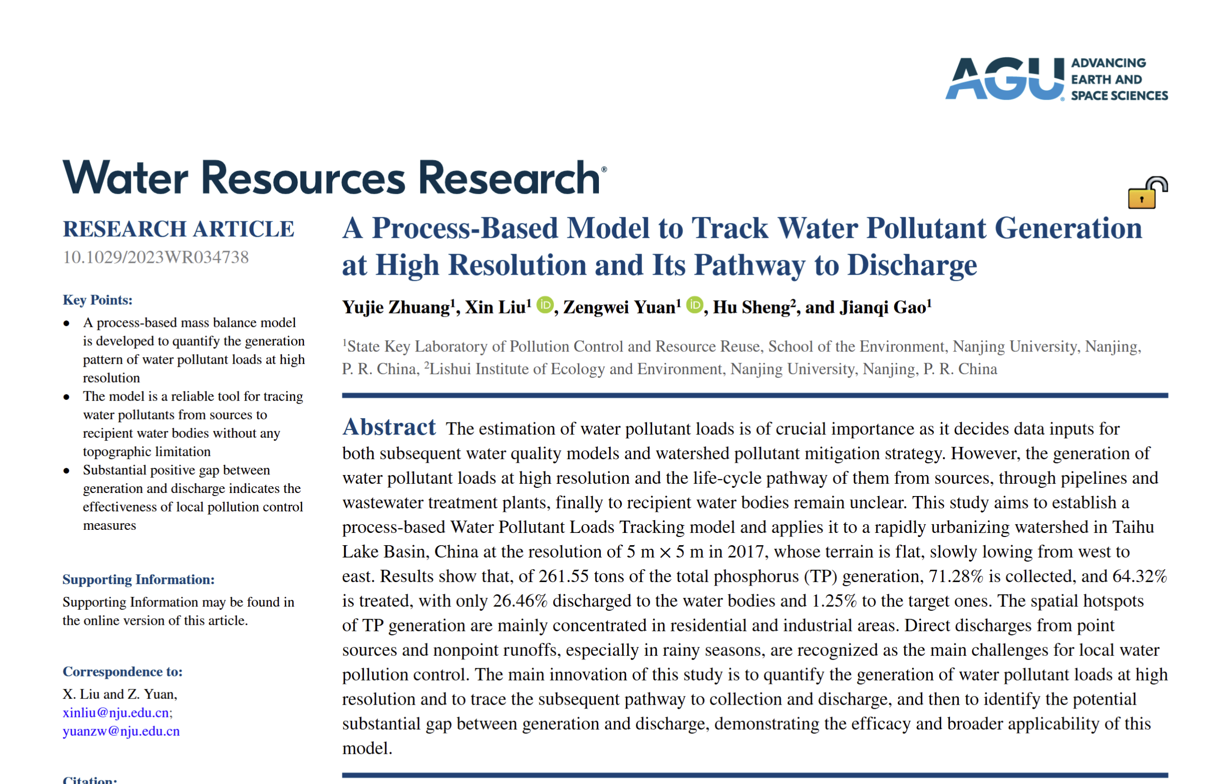 1. Zhuang Y., Liu X.*, Yuan Z.*, Sheng H., Gao J. A process-based model to track water pollutant generation at high resolution and its pathway to discharge. Water Resources Research, 59(12), e2023WR034738 (2023).