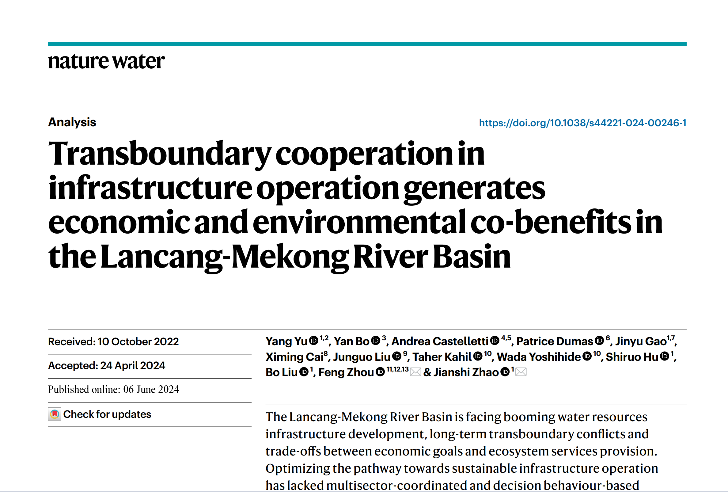 本团队合作承担了国家重点研发计划课题、国家自然科学基金国际合作重点项目、第二次青藏科考等多个国家级项目,取得了一批在国际上有较大影响力的原创性成果,以第一或通讯作者在PNAS、Nature Water、Nature Food、Nature Communications、National Science Review等国际顶级期刊合作发表10余篇,获教育部科技进步一等奖、云南省科技进步一等奖、湖北省科技进步一等奖、中国生态环境十大科技进展、中国地理科学十大进展、大禹水利科技进步一等奖,撰写的政策建议被ZB采用。