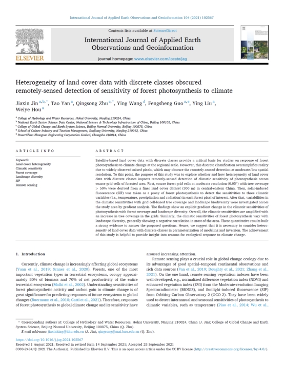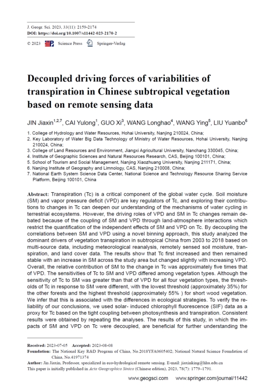 戴雪(1988.11—),女,博士,副研究员,硕士生导师。主要从事生态水文学及气候变化生态学领域的教学和科研工作,主要研究方向包括:气候及流域水情变化对生态过程的影响机制与效应、湿地生态系统演变的过程与归因、地表参数的尺度转换、遥感数据与方法的不确定性等。主持国家自然科学基金项目、全国重点实验室开放基金项目、中国博士后基金项目、中央高校科研业务费项目等10余项,并作为学术骨干参与国家重点研发计划项目、中科院重点部署项目、国家自然科学基金面上项目等项目20余项。担任Journal of Hydrology等多个期刊特邀审稿人、入选中国博士后创新人才支持计划;获Journal of Geographical Science“高影响力论文奖”、《湖泊科学》“优秀审稿人”、中国自然资源学会“优秀青年论文奖”以及江苏省地理学会“优秀学术报告”等多项荣誉。已在Journal of Geographical Science、Frontiers in Plant Science、Hydrological Processes、Hydrobiologia等杂志发表高质量论文20余篇,出版学术专著1部,授权发明专利3项。